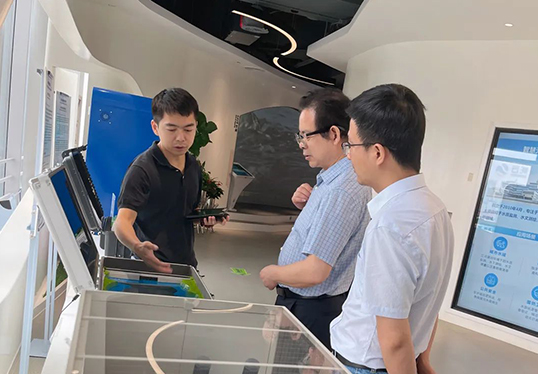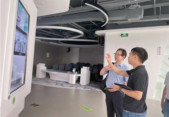 葉昌明董事長一行首先在中心技術(shù)產(chǎn)業(yè)部產(chǎn)品經(jīng)理?xiàng)顧?quán)的熱情帶引下參觀了中心展示大廳,了解了中心的基本情況、軟硬件建設(shè)情況及相關(guān)技術(shù)產(chǎn)品的具體情況。