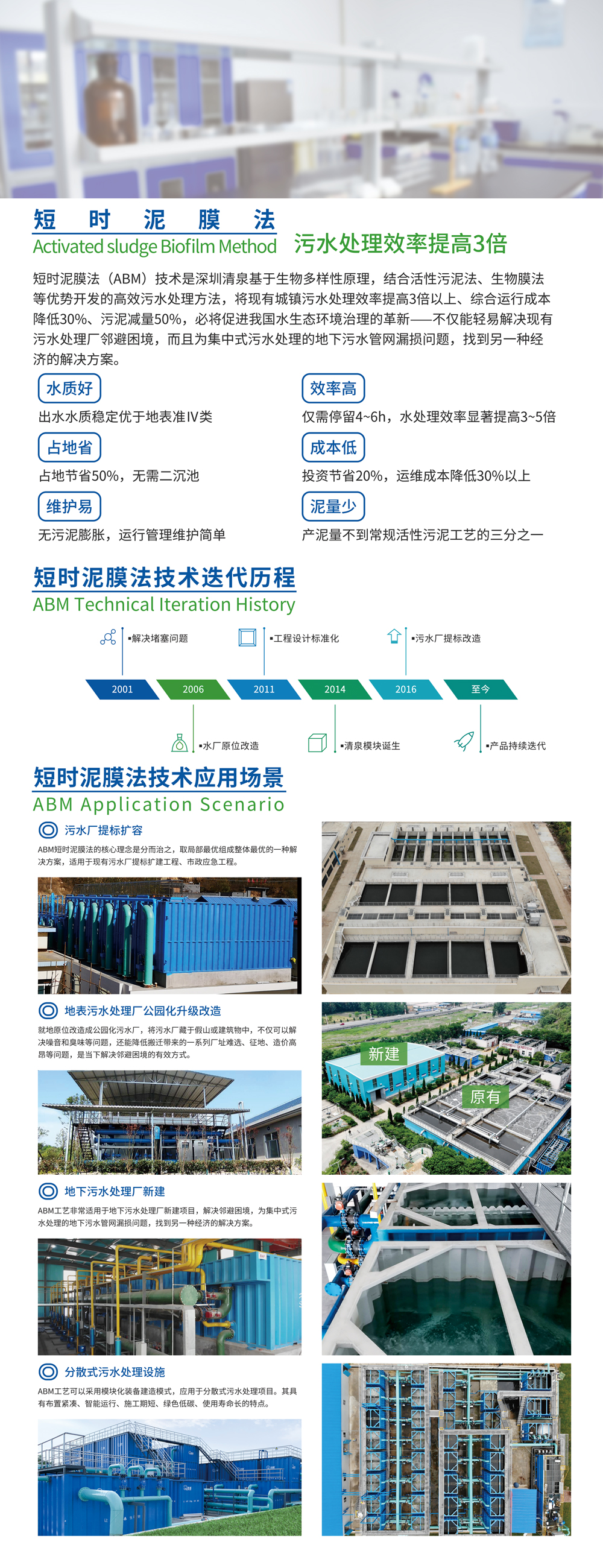清泉人并沒有因此停步,反而以此為基礎,開發(fā)出了短時泥膜法(ABM)技術,該技術不僅集深圳清泉的技術優(yōu)勢于一身,更能將現(xiàn)有城鎮(zhèn)污水處理廠效率提高3倍以上,是一種經(jīng)濟可行又極有優(yōu)勢的高效污水處理方法。并且開發(fā)了“清泉模塊”系列產(chǎn)品,可廣泛應用于分散式污水處理、嵌入式污水處理廠、工業(yè)園區(qū)污水資源化、污水廠公園化升級改造、分布式自來水廠、水產(chǎn)養(yǎng)殖水處理等。